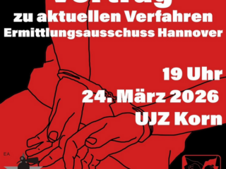 Dienstag – 24.03.2026, 19:00UJZ Korn Zum Internationalen Tag Der Politischen Gefangenen Liebe Gefährt*innen,mit Verfahren und Verurteilungen im Kontext von “Antifa-Ost” und “Budapest-Komplex” hat die Repression gegen Antifaschist*innen in Deutschland ein neues Level erreicht. Während der Paragraf 129 lange als “Schnüffelparagraf” galt, spielt er eine immer größere Rolle – auch für die Verurteilung zu langjährigen Haftstrafen….