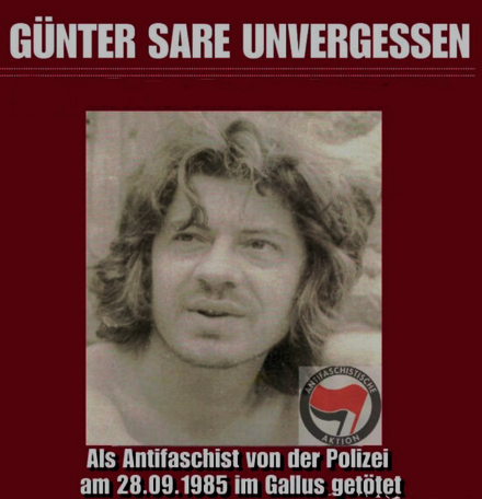 Günter Sare war 36 Jahre alt als er starb. Der Maschinenschlosser war seit vielen Jahren in der linken Szene Frankfurts aktiv. Er baute das selbstverwaltete Jugendzentrum Bockenheim mit auf, war dort auch Vorstandsmitglied und bekannt durch seine regelmäßigen Thekendienste.