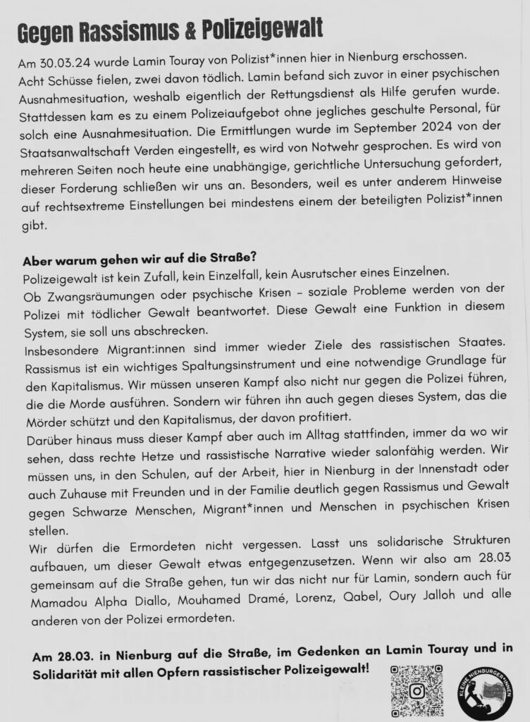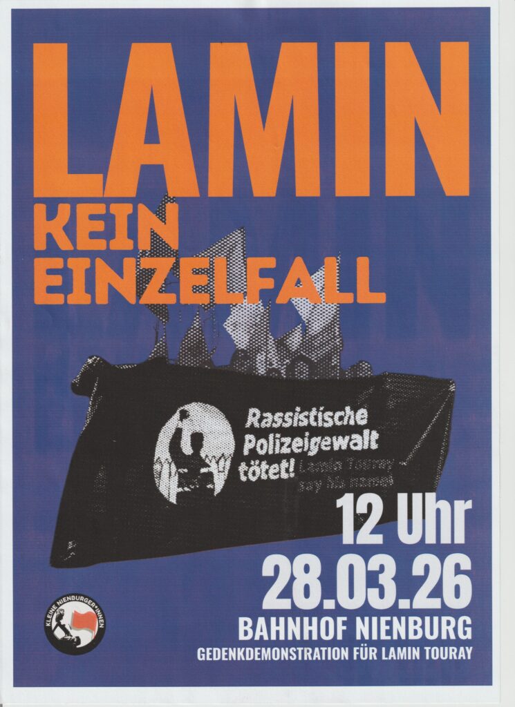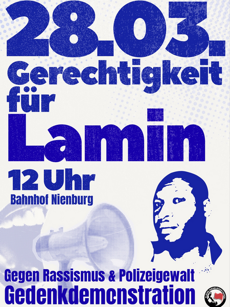 Am 28.03 gemeinsam auf die Straße, nicht nur für Lamin sondern auch gegen Rassismus und Polizeigewalt. Es sind keine Einzelfälle und darum müssen wir weiter laut bleiben. Gedenken heißt kämpfen und das wollen wir in Nienburg tun. Wir wollen solidarisch sein mit allen von Rassismus und Polizeigewalt Betroffenen!